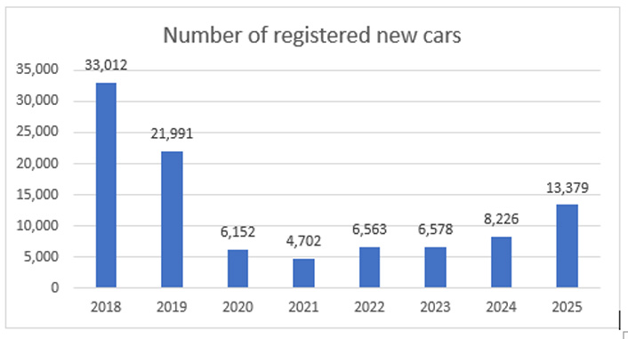 The number of registered new cars still represents 41 percent of the precrisis amount in 2018 which totaled more than 33,000.
