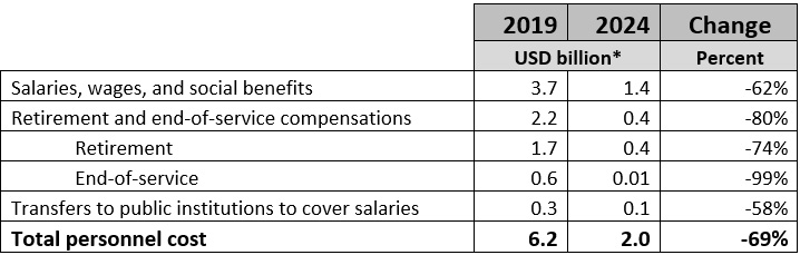 Total personnel cost in the public sector, which includes salaries, wages and social benefits as well as retirement and end-of-service compensations of civilian and military personnel, dropped by 69 percent in terms of dollars to $2 billion in 2024 from $6.2 billion in 2019.